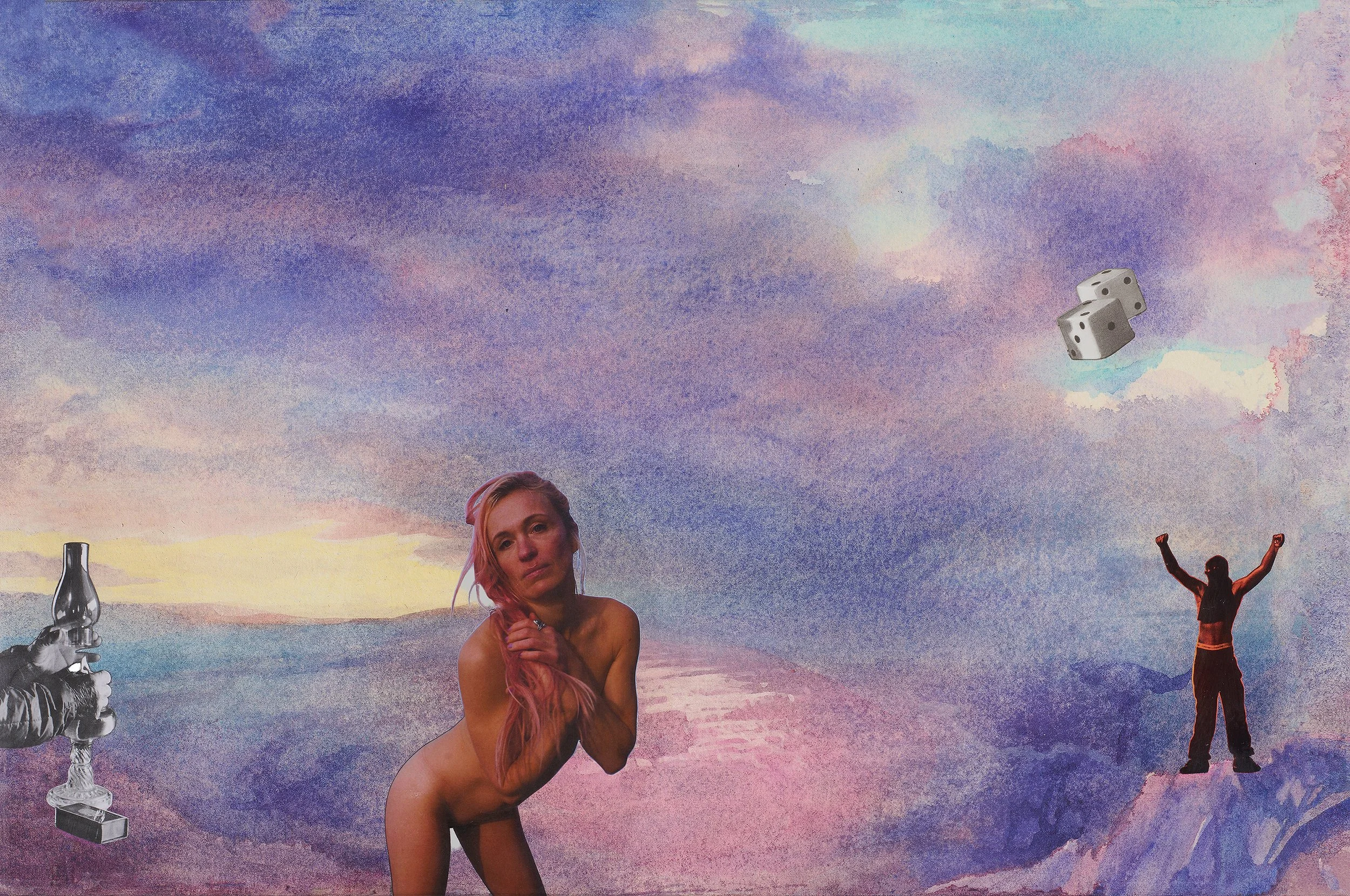 THE PAST ©2023, 30 x24 paper collage on a pigment ink jet print on canvas from a gouache painting, $1800. This collaboration began with a large gouache. For us, the wide open vistas of the American West invite reflection and symbolize the passage of time, of eons bygone. In Vanessa’s narrative in cut paper collage, this work celebrates the transition from the past into a new beginning, with new possibilities. Her use of the black and white ‘ritual’ images of Diane Arbus enhances the contrast of the timeless and transitory in this work. “I’m particularly drawn to how she would document the celebrations of folks on the fringes of society- for instance a birthday party at an asylum. After all, everyone has the right to celebrate” The hands cradle peyote, a symbol of the magic in transformation, the hidden sacred power in this magical existence. Available at Krinshaw Studios.