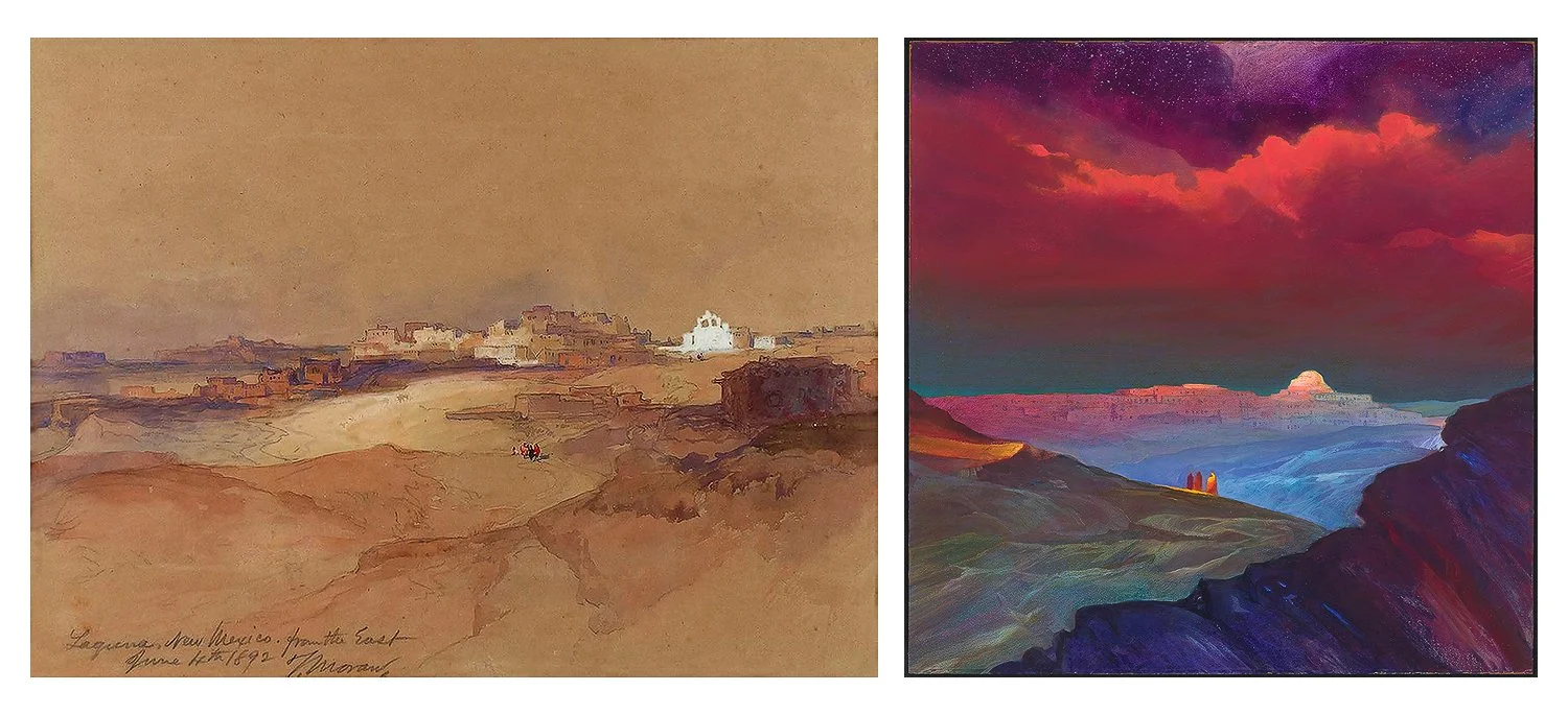 Left: Thomas Moran’s Laguna, New Mexico Looking from the East, a watercolor, gouache, and pencil on paper from 1891. Right: Lost City, ©2018, watercolor and acrylic on vintage Arches cold pressed paper attached to a cradled birch panel with a hand-painted edge patina, 28 x 28. Inspired by the Thomas Moran sketch, Vanessa established the theme and composition with a drawing and watercolor underpainting, which I embellished futher with acrylic paint. This was our first major collaboration. Lost City is available as a 16 x 16 fine art print.