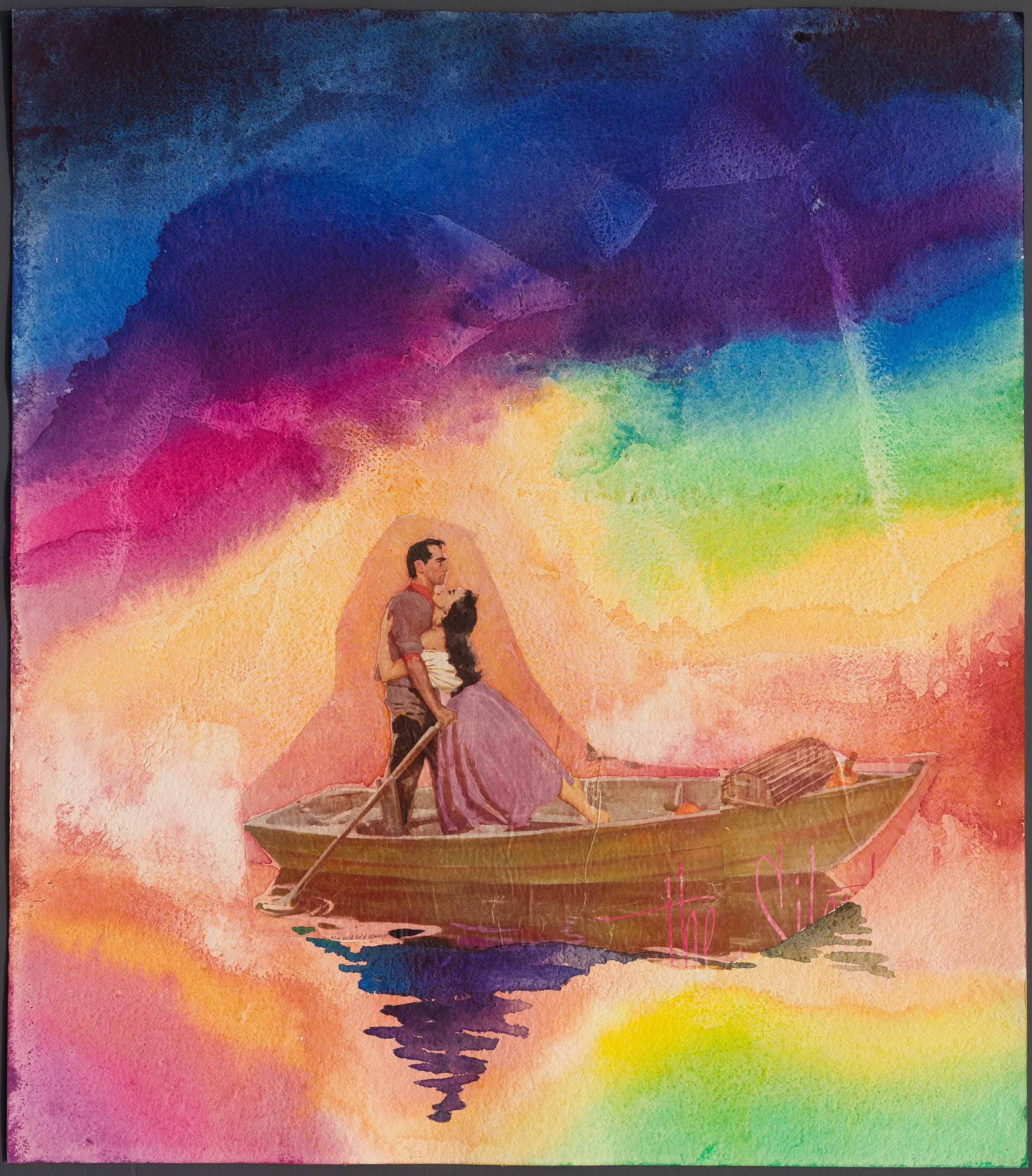 Tie-Dye Love, ©2018 watercolor and printed paper collage on vintage Arches cold press watercolor paper, 25 x 22. With this piece, Vanessa created the theme and narrative with cut-paper collage. I followed, painting a watercolor background.