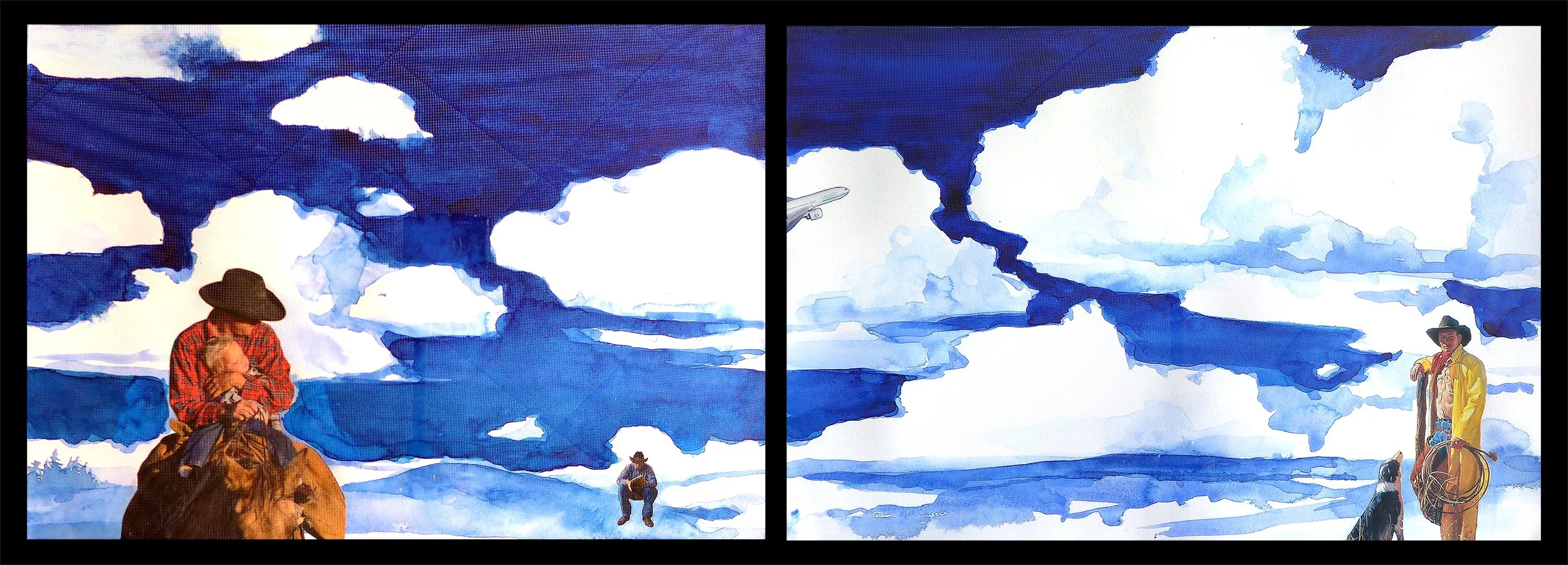 Brothers in Arms and Big Sky Country, ©2018, diptych watercolor and printed paper collage on Rives paper, 11 x 15 each and framed separately. In this work, I painted several watercolor backgrounds, and Vanessa created the theme and narrative with cut-paper collage. Big Sky Country (on the right) is available from Krinshaw Studios.